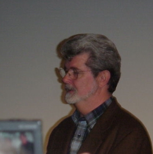 De gauche à droite, un écran numérique, George Lucas, vêtu d'une somptueuse chemise à carreaux et d'une veste campagnarde d'assez mauvais goût.